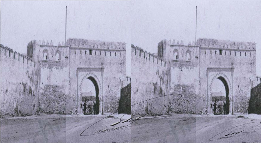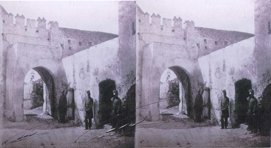| la Puerta del Reina,(Bab L3u9la )en Tetuán.1860 Vista estereoscópica de Facio |